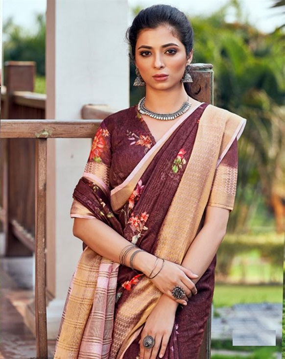 This soft linen silk with a zari border and pallu is showing the feel of cute and graceful. The ethnic printed and zari work border adds a sign of elegance statement for the look.