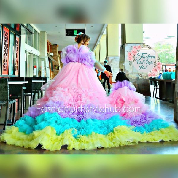 The price mentioned is just for Mother frock only.~The tail is detachable ~Color can be customised Stuff Material Silk, Net, and Sequin cloth is used in bodice, cancan net is used under the frock to give it volume and a Fluffy look.